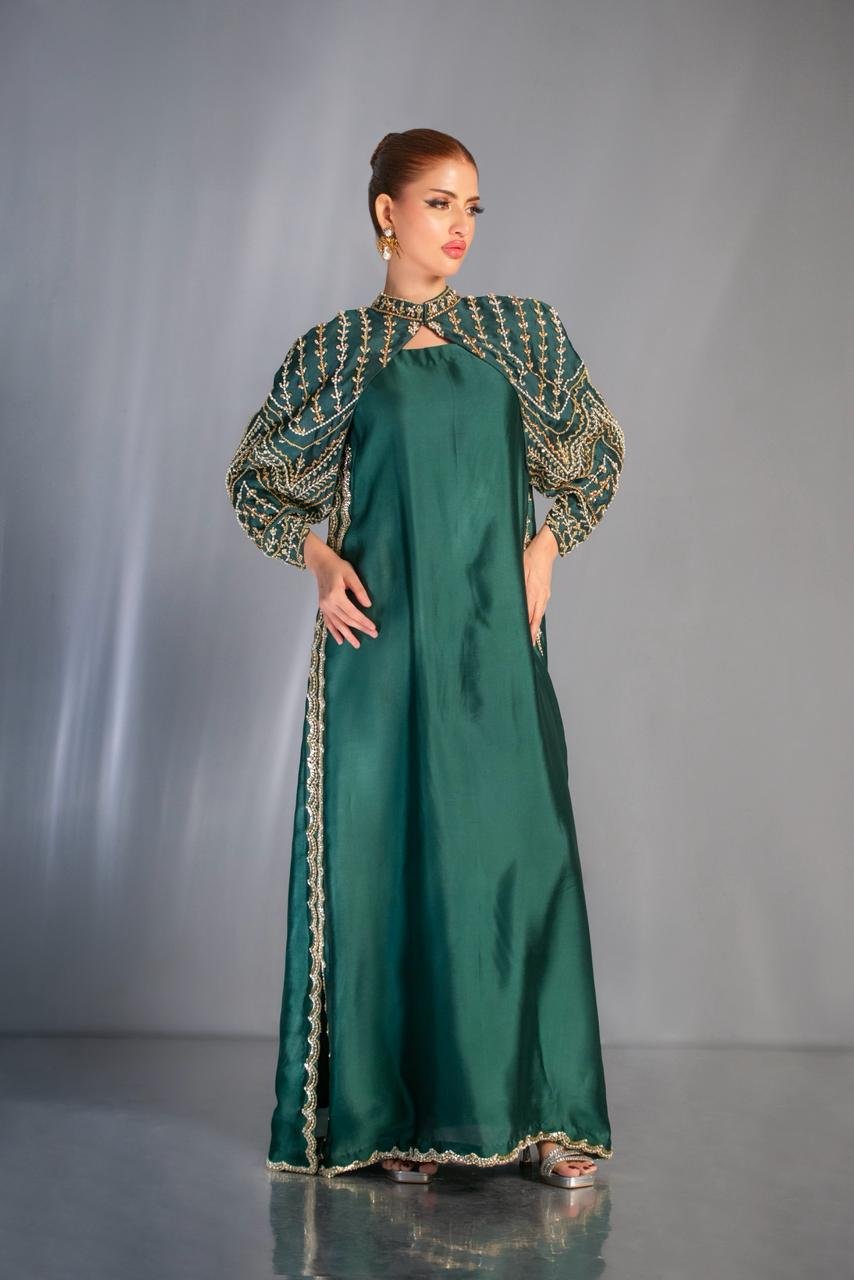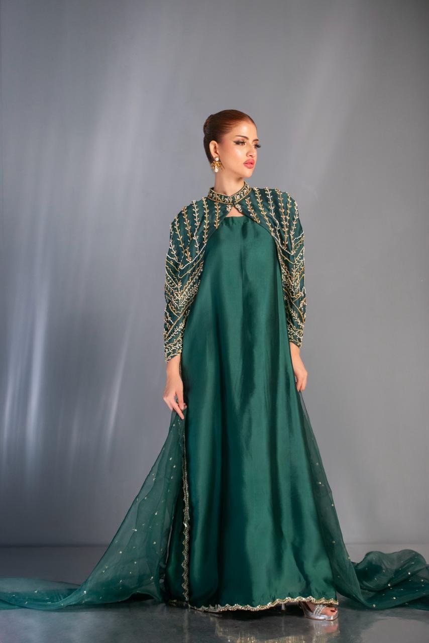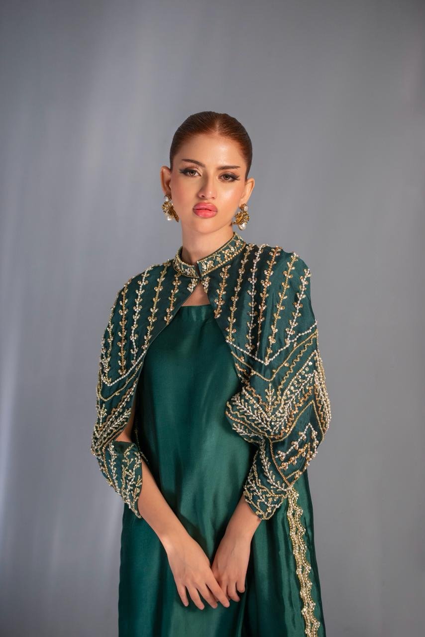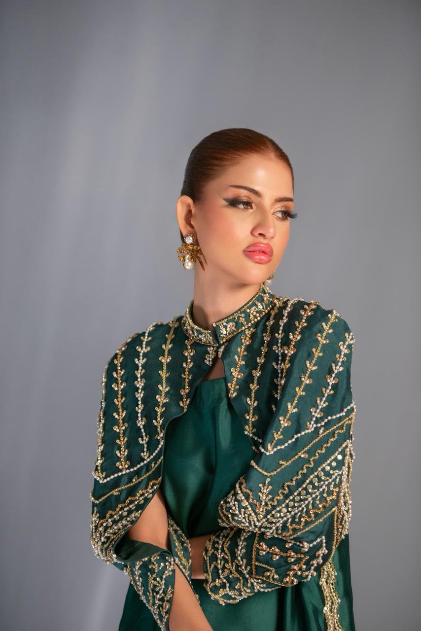 In a striking emerald tone, this look flows with majestic ease — a silhouette crafted to celebrate grace in its purest form. The hand-embellished cape, adorned with gold motifs, frames the ensemble like a regal armor, adding depth, drama, and a whisper of old-world grandeur